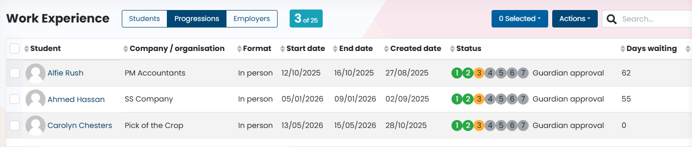 Progressions, you can see the placements in progress with the status. Use the filters to see which students are at which stage. You can chase all parties in this area.