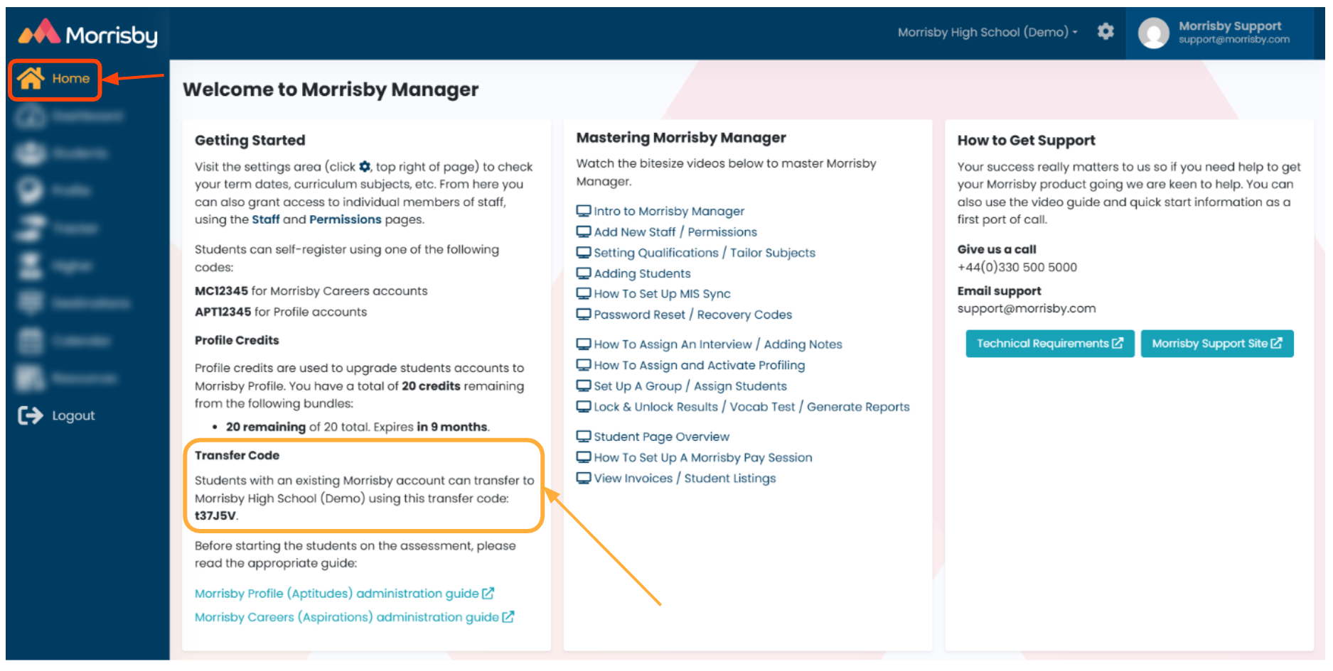 New students to your organisation can transfer their existing Morrisby account (should they have one) using a transfer code. Due to GDPR and our data policy, Morrisby requires students to transfer their accounts themselves. Your centre transfer code is available on the Morrisby Manager homepage in the Getting Started tile.